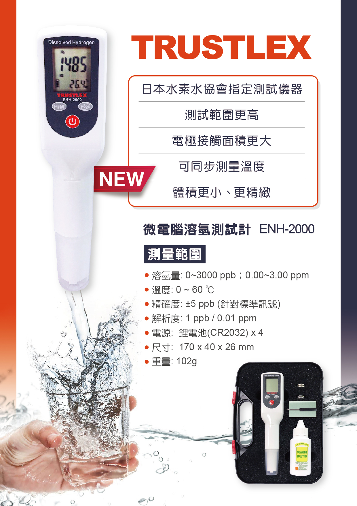 本測定儀,用於測量電解水生成器及氫水發生器生成水中的溶解氫氣含量而開發。 監製:岡山理科大學名譽教授 石井 猛